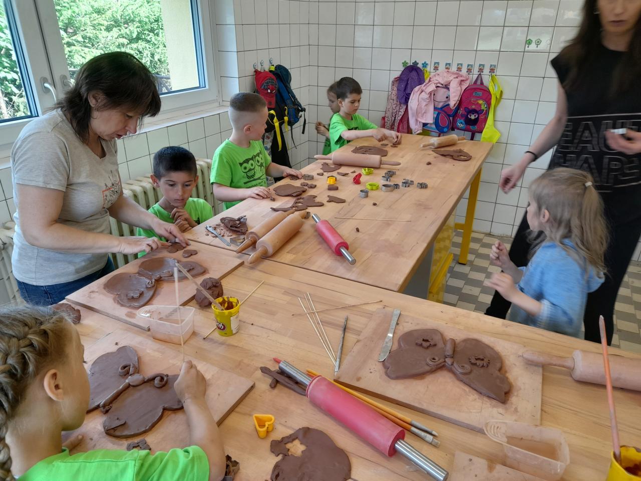Návštěva v ZŠ Bakov nad Jizerou bylo spojeno s prohlídkou školy a nových učeben. V keramické dílně jsme si s dětmi mohly vyzkoušet, jak se opracovává hlína a jakým způsobem je možné vytvořit dekoraci.